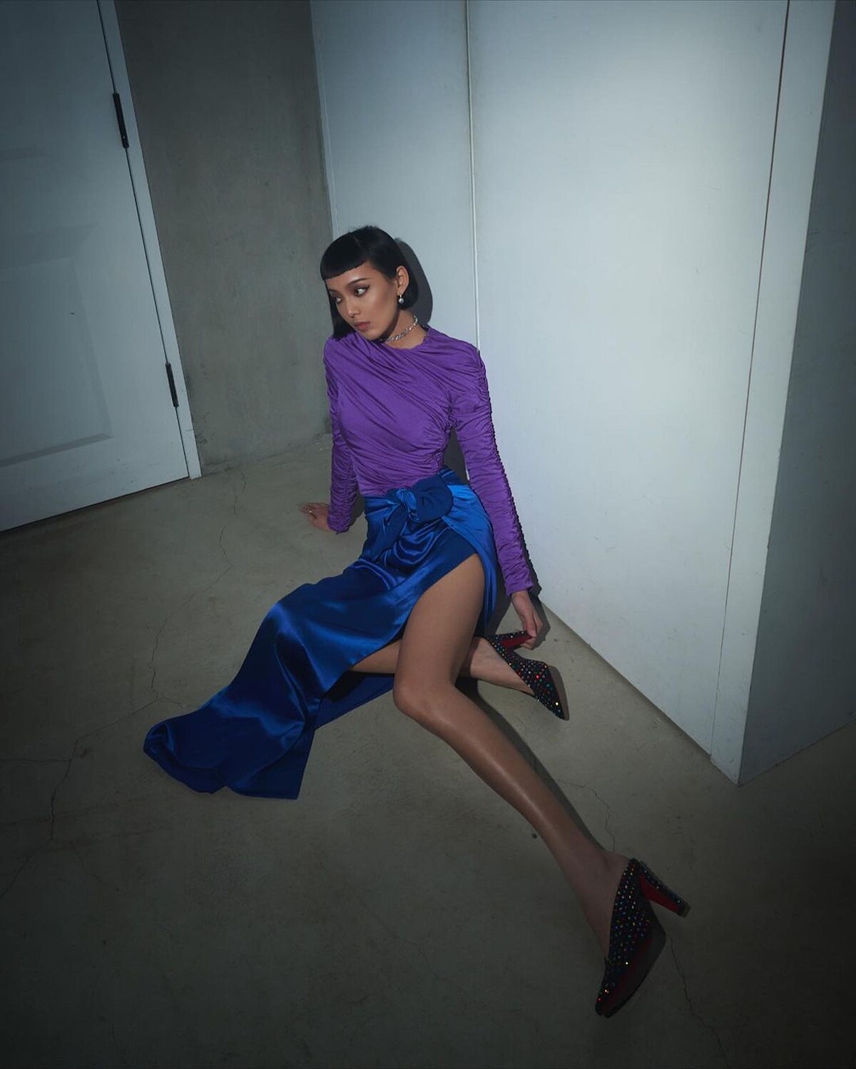 李函運用撞色技巧,以紫色抓皺上衣搭配金屬藍高衩裙,呼應鞋款的金屬細節,展現修長女人味與率性時髦風格。