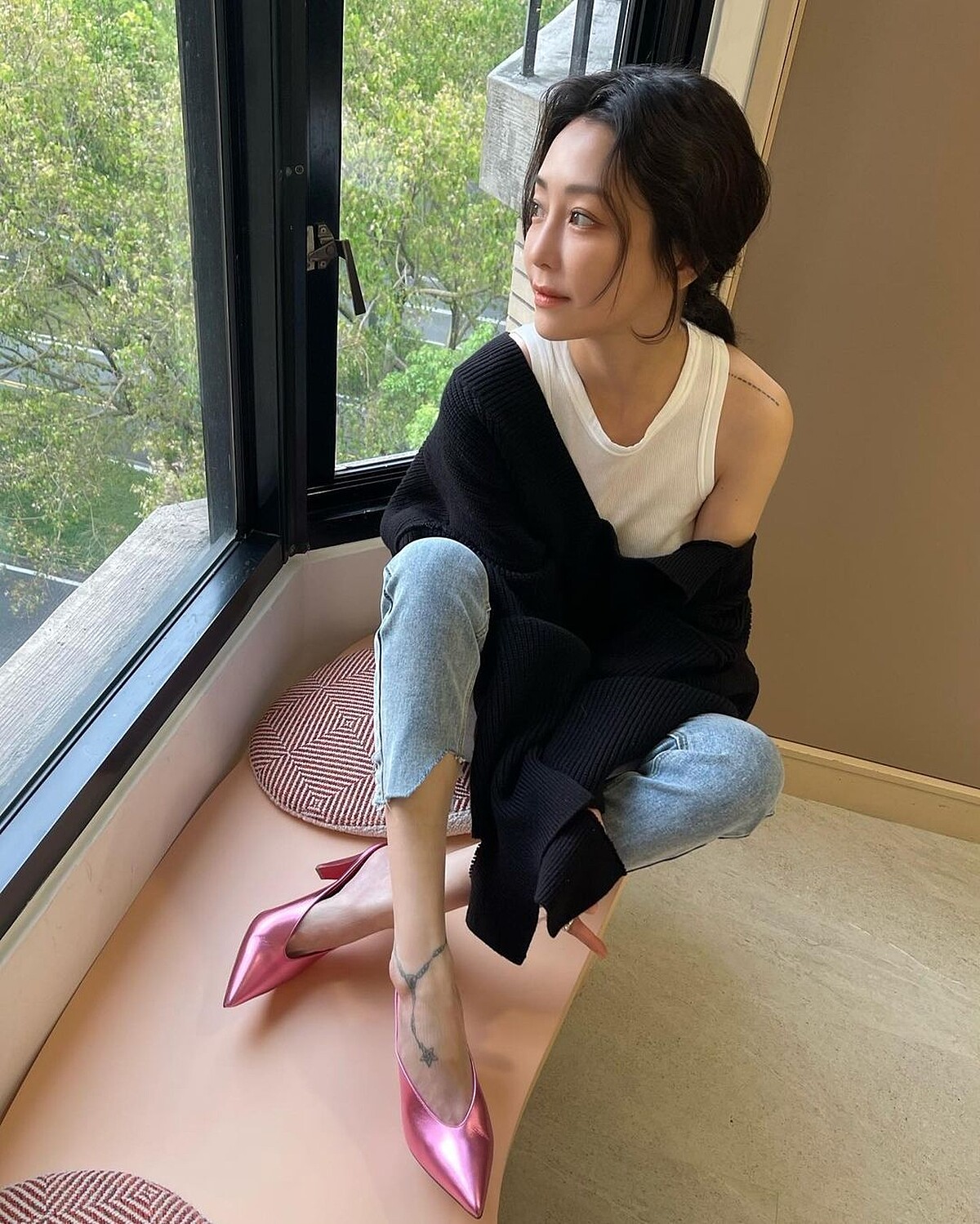 謝欣穎運用簡單的黑白上身搭配丹寧褲,將重點放在鞋子上,粉色金屬色調的 Veryvee 高跟穆勒鞋聚焦整體,達到吸引目光的效果。