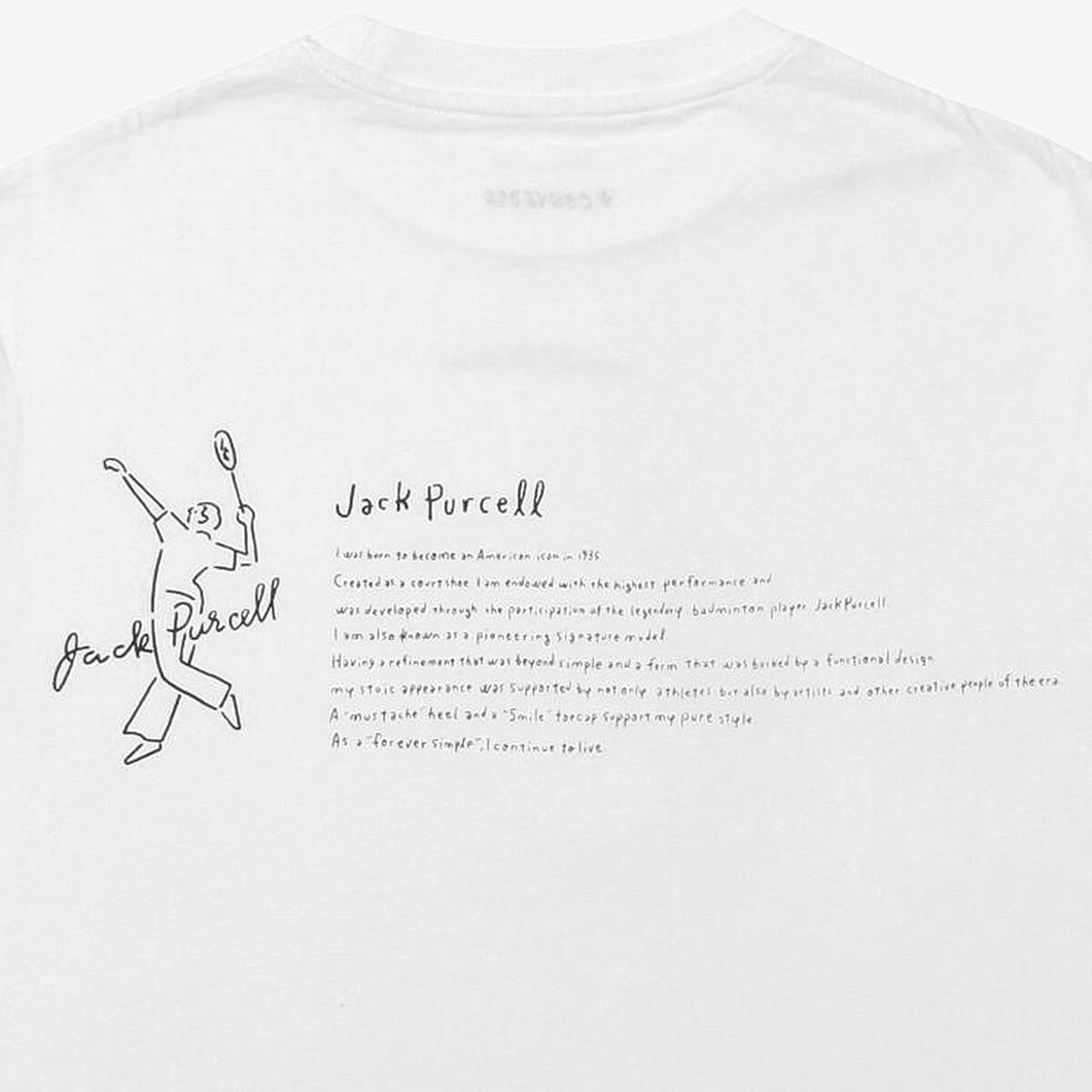 除了帆布鞋,今年也有推出白色手繪T,衣服正面以Jack Purcell代表logo示意;背面則針對「開口笑」帆布鞋的誕生做了一段文字的介紹,附上Jack Purcell的小插圖點綴。