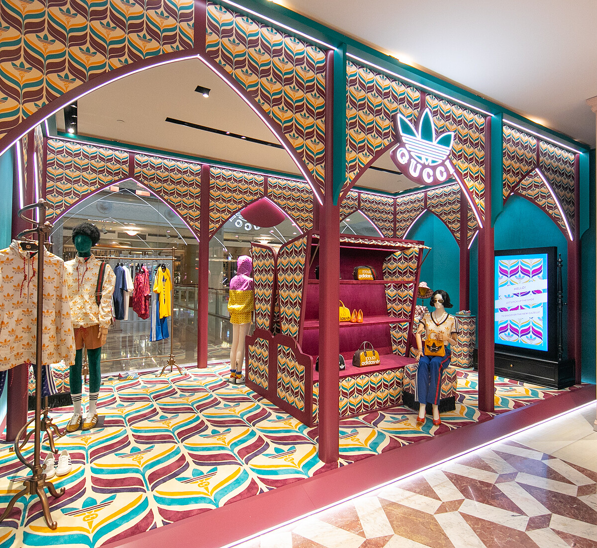 迎接adidas X Gucci聯名系列在台灣開賣,Gucci特別在台北101、台中新光三越專賣店內開設adidas X Gucci限時店中店,承襲創意總監Alessandro Michele的萬花筒靈感來源,將店鋪一角運用Gucci經典GG標誌和adidas三葉草圖騰,打造成極具復古風格的萬花筒視覺,即日起到6月28日限時登場。