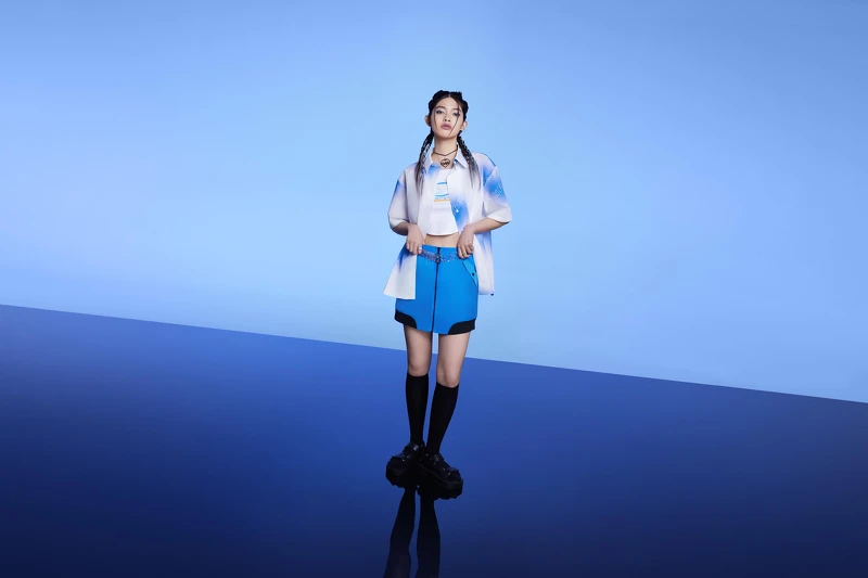 彷彿走入未來空間,藍、白、黑的色調運用能夠在夏日造型中呈現舒適的視覺感同時兼具沉穩氣質,建議可以搭配Oversize的開領襯衫讓造型增添層次。