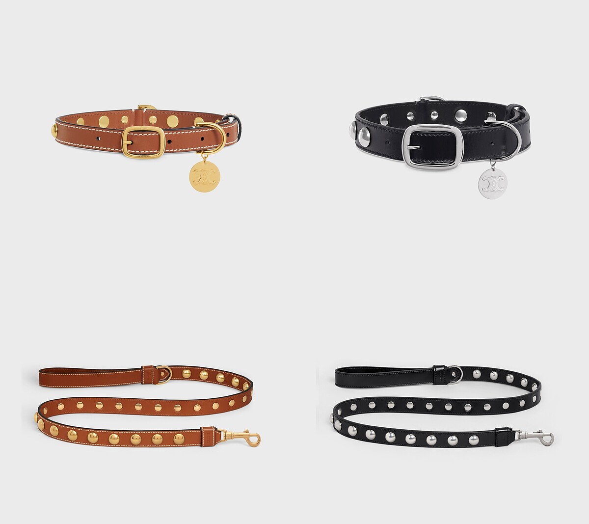 喜歡個性一點的,CELINE的牽繩與項圈另有鉚釘樣式,有兩大色系組合:焦糖色小牛皮綴以金色鉚釘、黑色小牛皮則是搭配銀色鉚釘,並分別附上一枚金銀色的Triomphe鎖片。