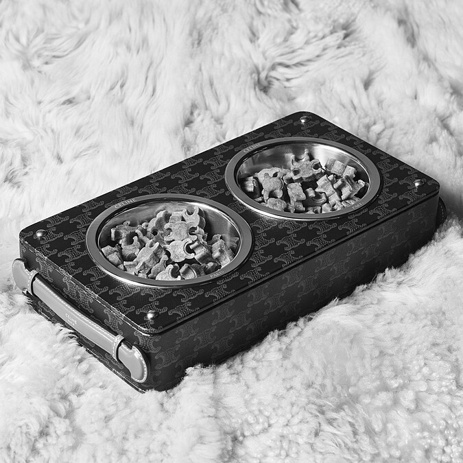 老花控尖叫,CELINE Triomphe Monogram做成寵物碗也太可愛!底部的碗托為木頭材質、外層鋪上Triomphe老花帆布,兩側還有小牛皮製成的把手;中間的金屬碗盆為可卸式,方便清洗。有單口和雙口兩種選擇。