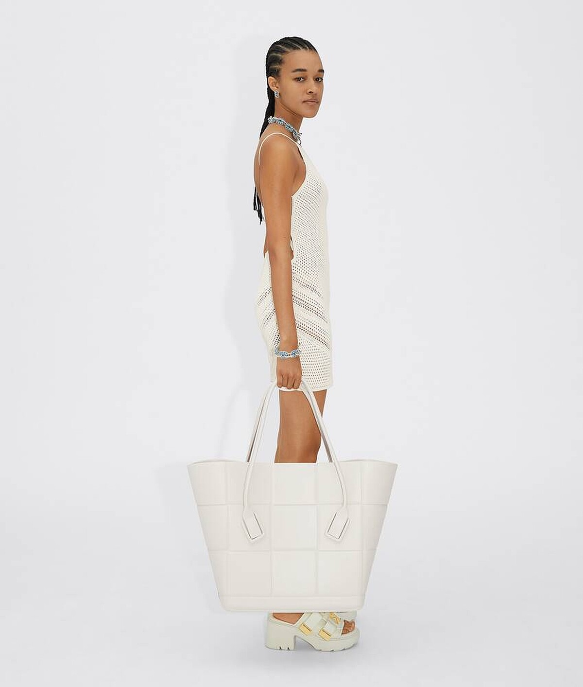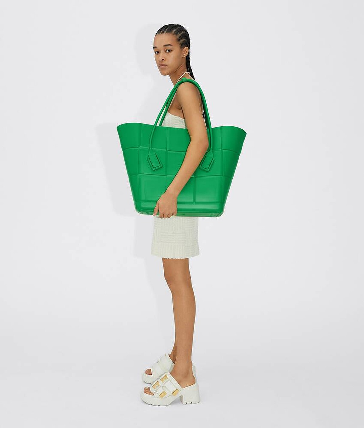 全新Arco Rubber系列以環保再生橡膠製作,搭配Bottega Veneta標誌性的Intreccio編織圖案,推出中型、迷你尺寸的托特包款,除了經典BV綠外,還有純潔白、亮橘色、檸檬黃、奇異果綠的配色,而它還有一個特點就是超輕量,就算是最大的中型托特包款拎起來也不覺得重。