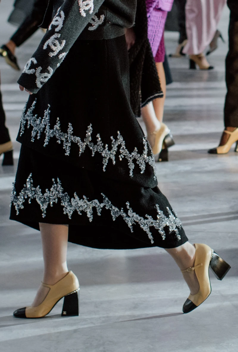 在眾多亮點單品中,小香迷都該收藏的經典雙色鞋,在本季有了截然不同的新面樣,Virginie Viard把女人都愛的珍珠元素,點綴在雙色鞋鞋跟的上緣處,一整排的珍珠設計,隨著行走的動作閃耀著光澤,還能為整體穿搭注入女神般的仙氣感。