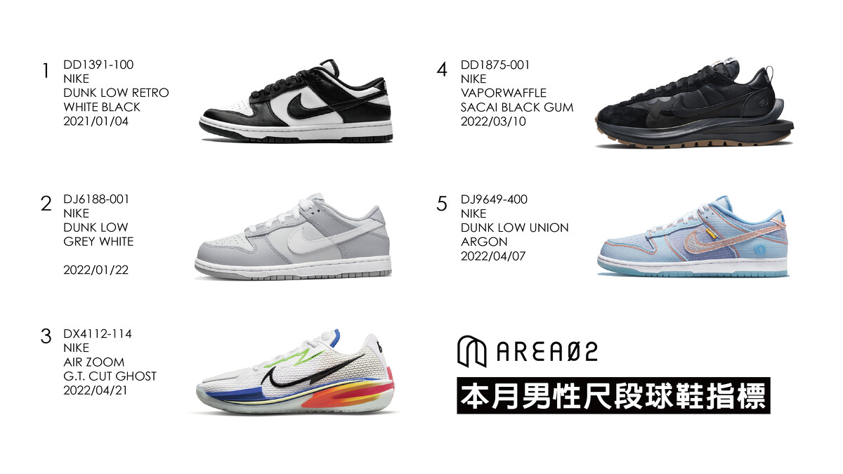 首先看到男生鞋款,從年初開始,Nike Dunk 一直主掌球鞋市場,尤其黑白熊貓「Whit Black」配色從全球名人不斷地推波助瀾,讓這雙看似基本的配色與款式熱度不減,甚至在本月成長80%成為當月冠軍!