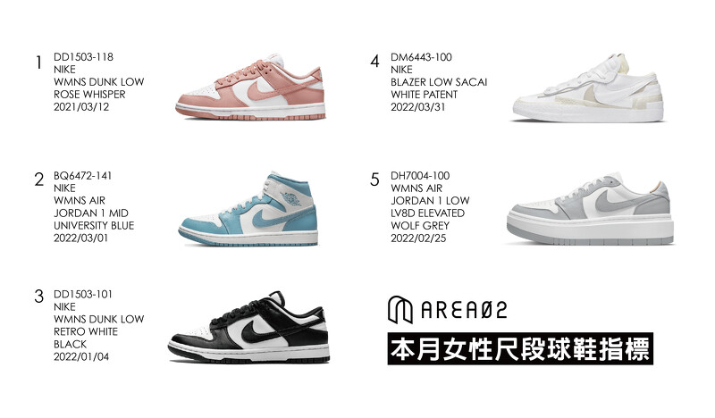 女生選鞋的參考與男生有些不同,「低筒」與「淺色系鞋款」為熱搜關鍵,可以看到五月冠軍鞋款為粉色系的 Nike Dunk Rose Whisper「乾燥玫瑰」拿下,除了適合夏日的配色,好搭配的鞋型也是大眾選鞋的要點。