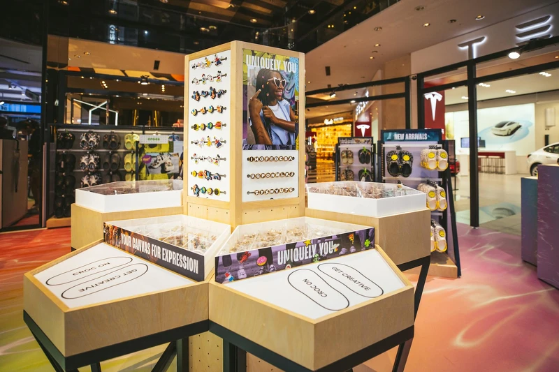 每次走進Crocs的店裡,對於選擇困難的人來說,絕對是一大挑戰。好不容易挑選出心儀的鞋款顏色,接著還有上百種的鞋扣挑選關卡要過。限時快閃店設立了Jibbitz鞋扣體驗站,提供立台可以放置拖鞋、直接撈取有興趣的鞋扣搭配,增添更即時性的DIY樂趣。