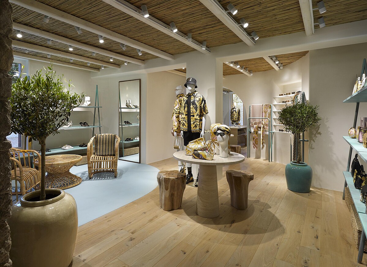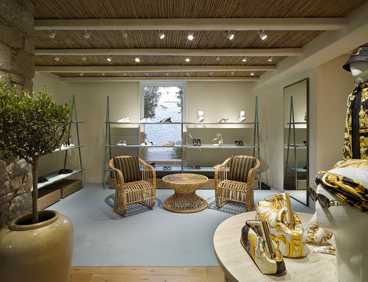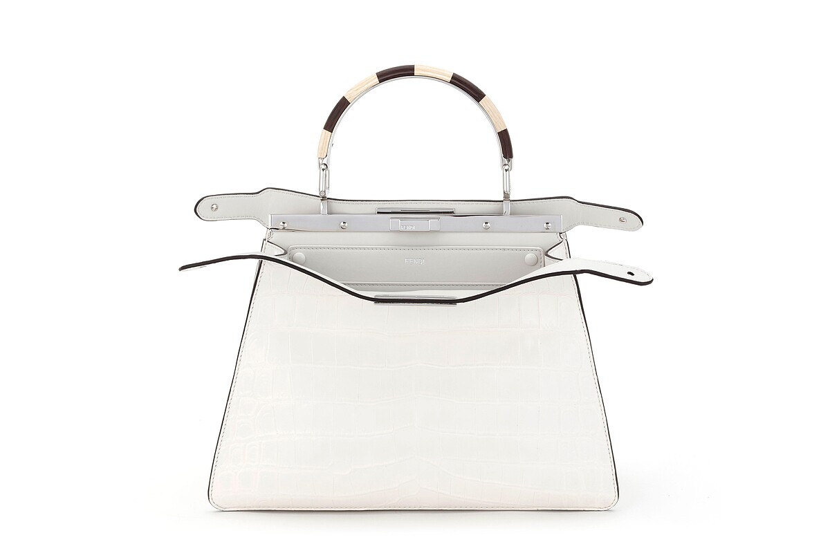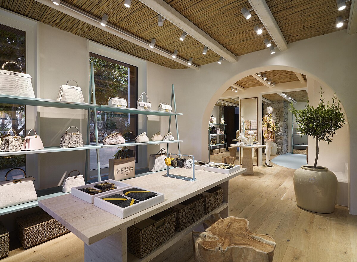 一眼就能辨識的地中海式白色外牆,店內則有圓形拱門、白色階梯,就連傢俱也都取材自米克諾斯島上的裝潢風格,一樓陳列手袋、配件和鞋履系列、二樓則展示男、女裝系列。另外,Fendi米克諾斯島精品店獨家開賣僅限歐洲地區才有的中型款式白色鱷魚皮Peekaboo ISeeU包款。