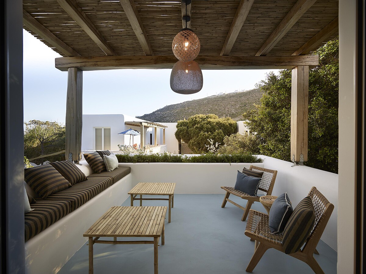 不能漏掉的角落,還有Fendi精心打造的露台,延續精品店內的裝修風格,淺藍色樹脂嵌條的地板,搭配拉菲草、竹製傢俱,還有可以眺望愛情海風景的休憩區。期待國外旅遊開放後,有機會親自走訪一趟希臘愛情海。