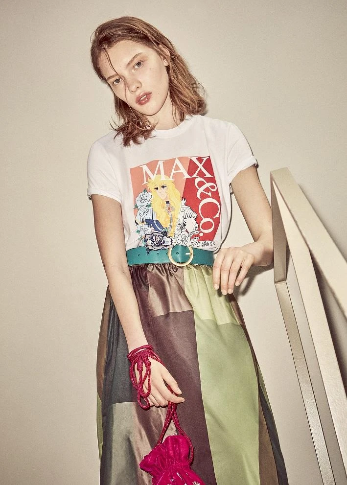 MAX&Co. 此次的「The &Co.llaboration」計畫攜手池田理代子打造,可以在系列形象中發現經典的漫畫人物呈現在衣服上,帶些灰色調的粉與綠更妝點了整個造型,讓視覺感不只是單純的浪漫氣息,反倒增添幾分帥氣。