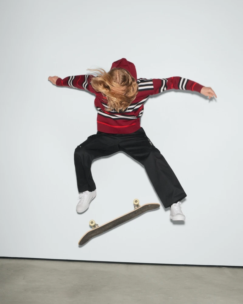 雙方特地從日本滑板文化擷取靈感,將Burberry徽標圖騰與Pop Trading Company經典標誌結合,同時把Burberry最具代表性的米色、樺木棕格紋圖案,全換成灰色、黑色和紅色的暈染色調。