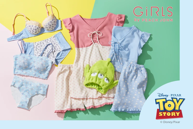 隨著電影《巴斯光年》於全球上映,日系內衣品牌Peach John特別攜手皮克斯動畫工作室最著名的作品《玩具總動員》,集合動畫中的經典角色胡迪、翠絲、牧羊女、三眼怪…打造又可愛又實穿的居家服、內衣組,還有洗頭髮必備的快乾吸水帽。