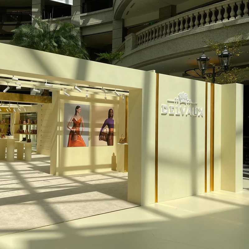 座落於貴婦百貨Bellavita一樓中庭,和煦的陽光穿過玻璃圓頂灑落在Delvaux台北期間限定店,帶著一絲愜意的歐洲午後街景風情。