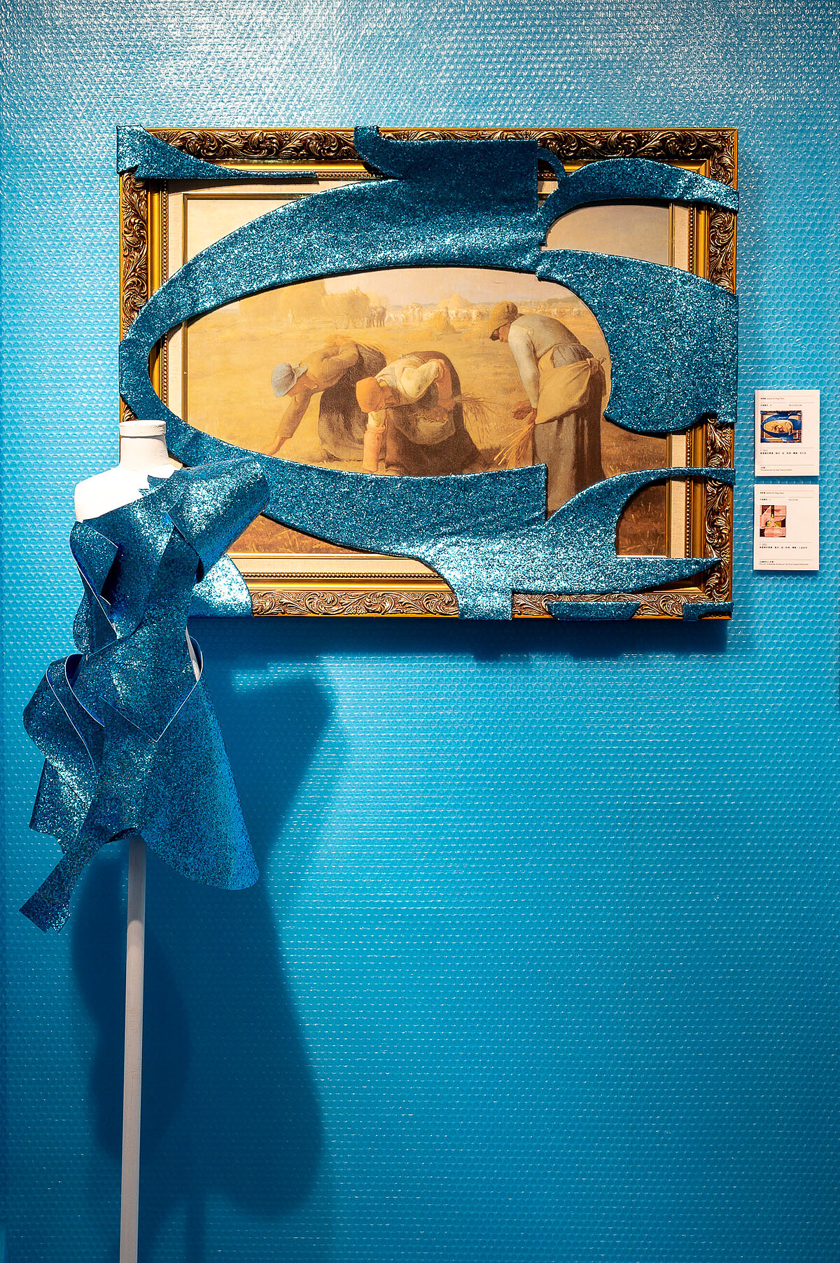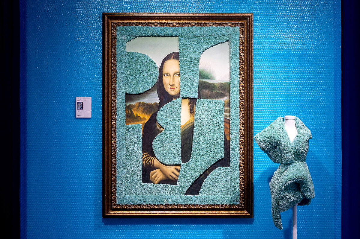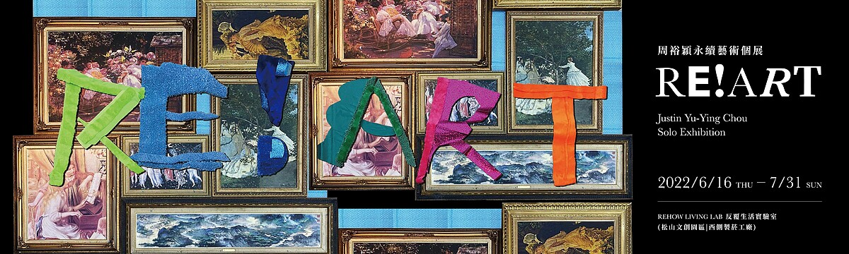 這次開啟的永續藝術展《RE!ART》為周裕穎首次個展,他將廢棄物回收再製,像是在路邊將多幅名畫如《蒙娜麗莎》、《拾穗》、《彈鋼琴的少女》等複製品撿回,結合幾何地毯布,如同他常在服裝設計使用的解構手法,拆解、二創,讓每件作品變得獨一無二,一切擁有了新的價值。