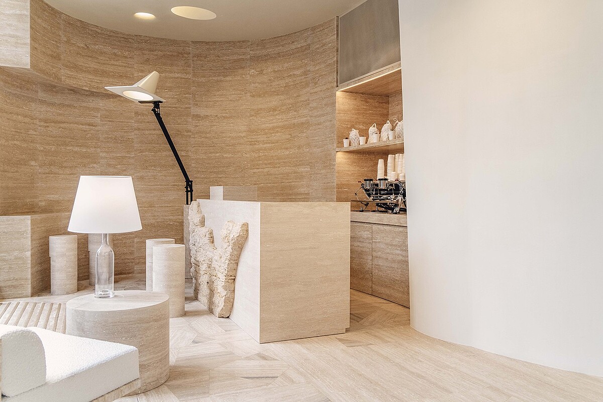 清一色療癒的米色店裝,保留石材的原始紋路,Maison Margiela Café的裝潢風格是當今頗為流行的侘寂風。複合式的經營模式,除了享受芬芳的咖啡香氣,店內角落另有陳設服飾、配件類商品。
