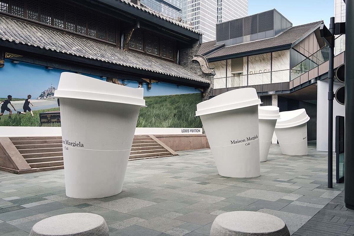 除了店內很好拍,店外的裝置藝術也很值得留念,一個個照了放大燈的的Maison Margiela外帶咖啡杯,歪歪斜斜地佇立著像是卡通場景一般,頗具童趣。