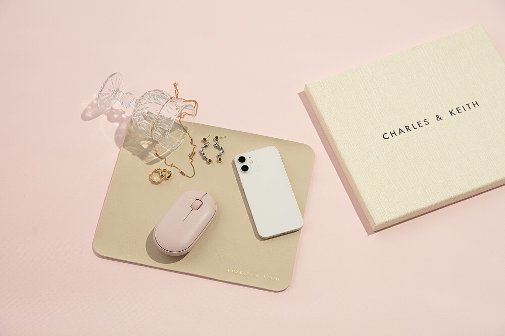 不僅在包裝上不馬虎,禮盒內還有小CK特別設計的沙漠玫瑰色置物墊,可以保護小廢包不受碰撞,還能當成滑鼠墊使用。