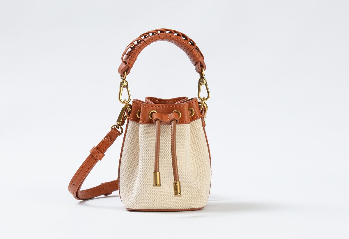 最後一款為拿鐵色的帆布水桶包,搭配編織細節的手提把,包身背面則點綴上金色Charles & Keith標誌。