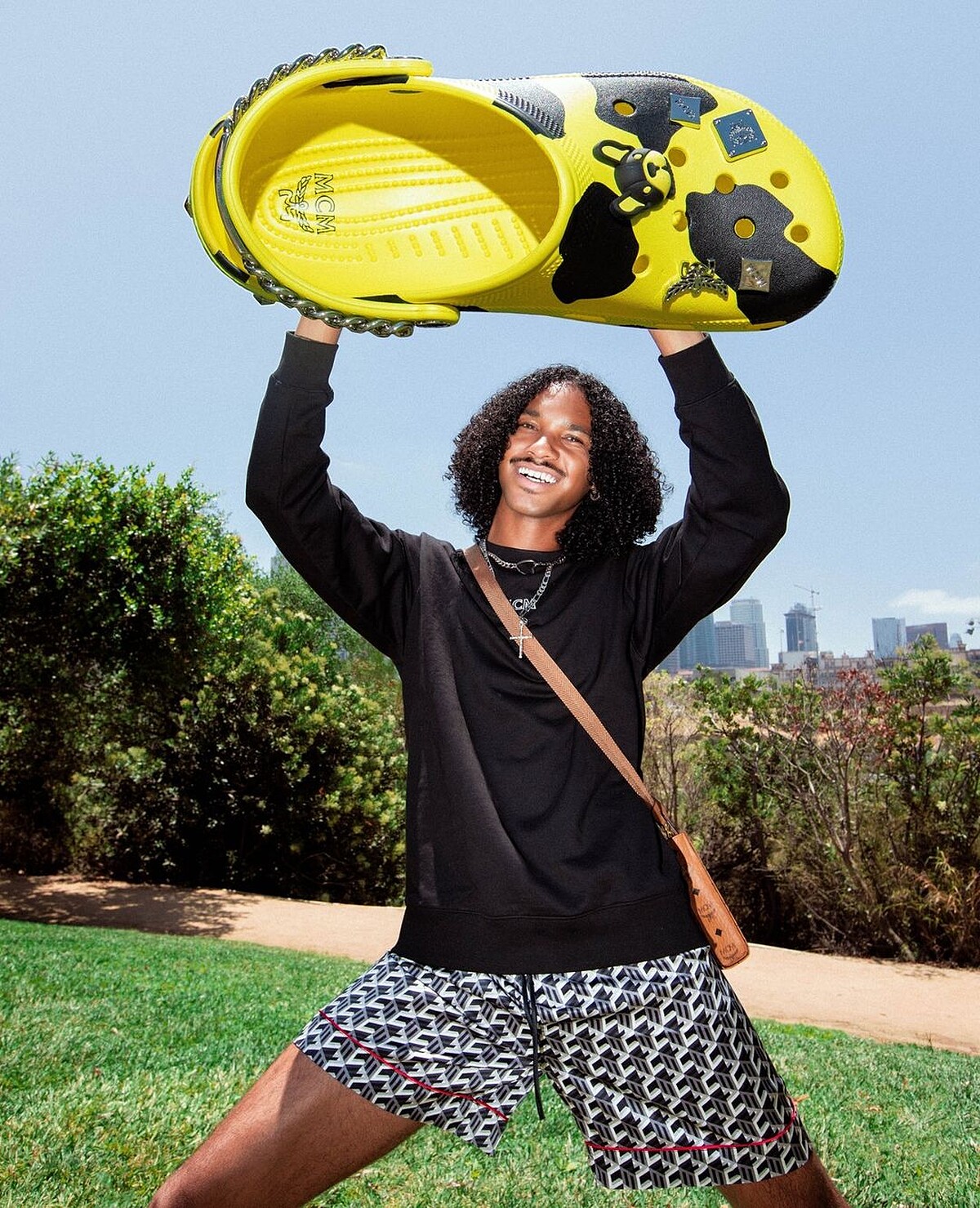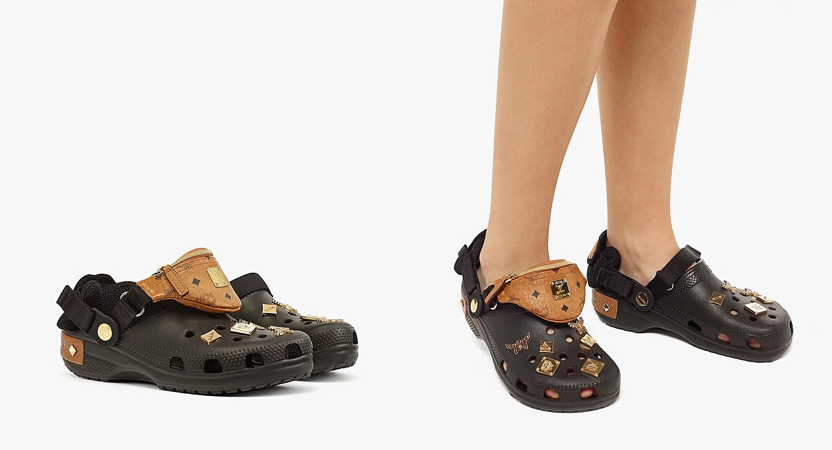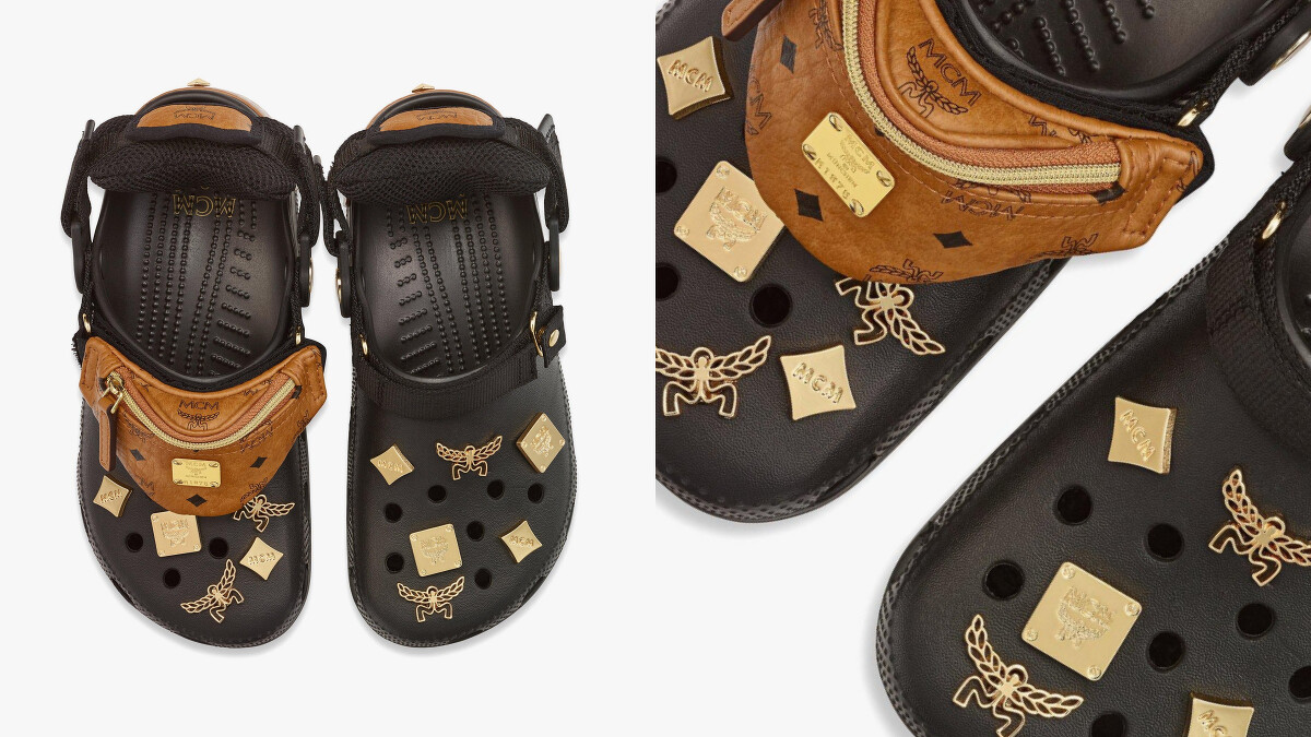 MCM開始在時尚圈橫著走,靠的就是老花面料的Fursten腰包,製成極小的奈米尺寸作為洞洞鞋上的裝飾,呼應腰包最初的輕巧攜帶,聯名款上的腰包為拆卸式、可另當手環配戴。