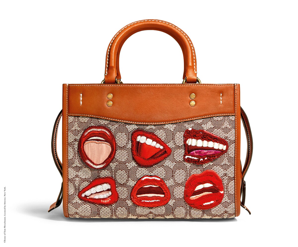運用Coach經典棒球手套鞣製皮革和Signature緹花面料拼接的Rogue Bag,加入湯姆韋塞爾曼經典紅唇刺繡圖案,六種不同的紅唇造型讓手袋更加吸睛。
