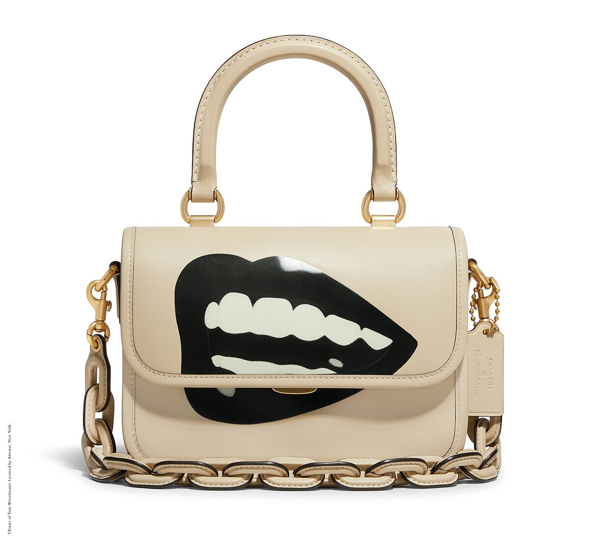 有手提把的Rogue包換上氣質燕麥奶色,包身中央放上湯姆韋塞爾曼的招牌嘴唇,唇黑齒白的設計別具巧思。