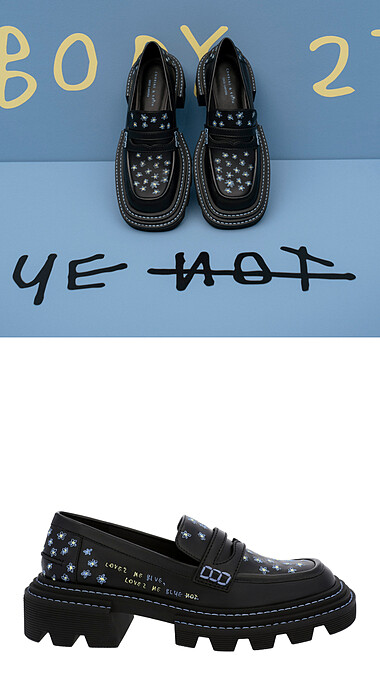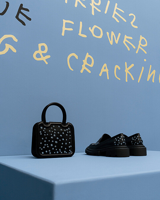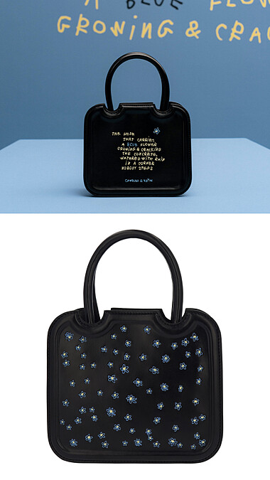 從Coco Capitán的攝影作品不難發現,小雛菊與藍色是她最鍾愛的兩個元素,將兩者結合,為樂福鞋與手提方包撰寫上不一樣的意境字句。