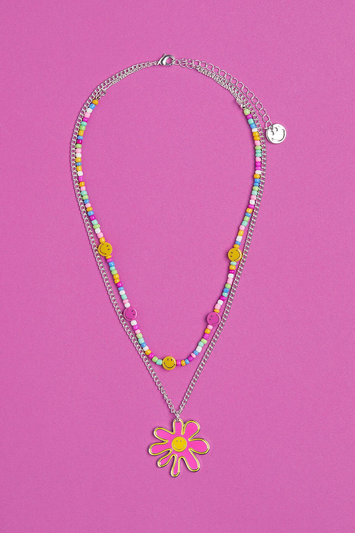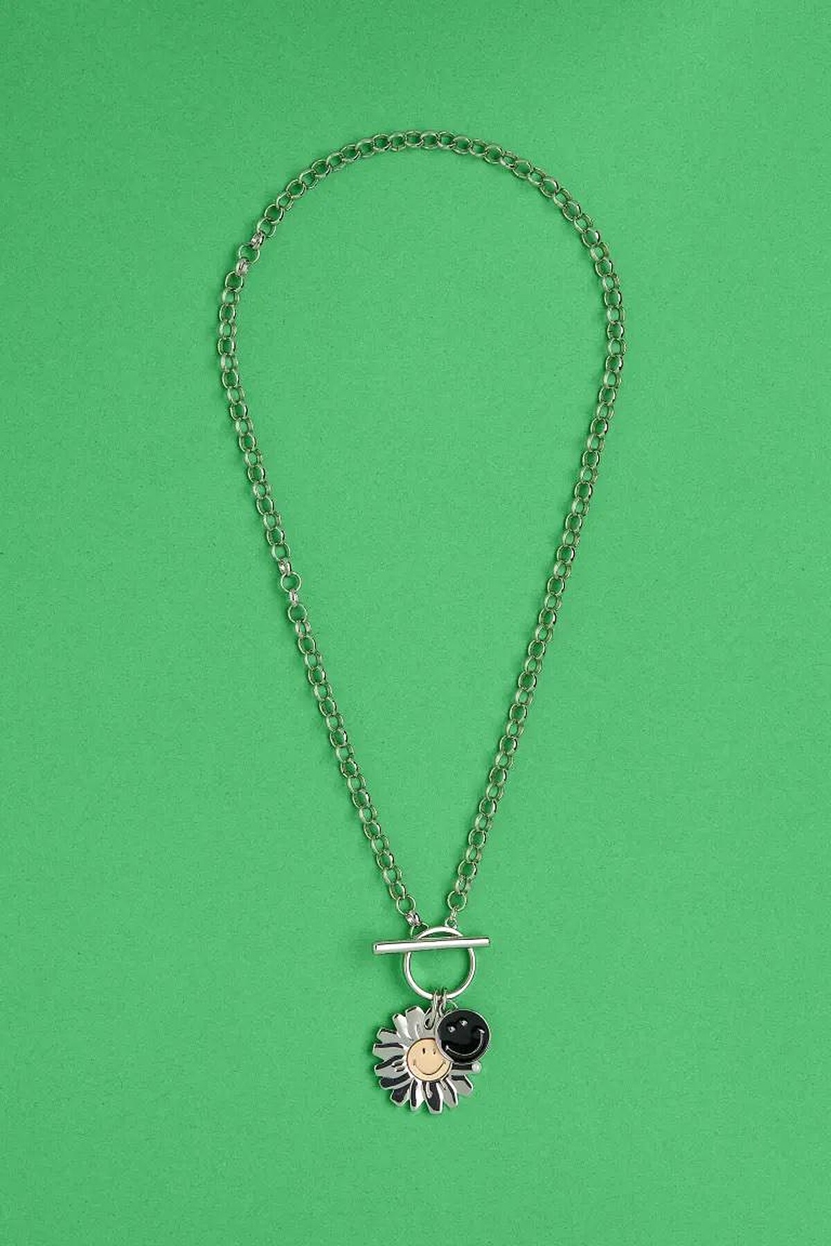 男裝女裝裡各有一款笑臉項鍊,一為較有個性的粗鏈搭配黑銀配色墜飾;另一雙股項鍊,以串珠鏈搭配金屬鏈,混搭疊戴也是現今頗為受歡迎的配戴方式。