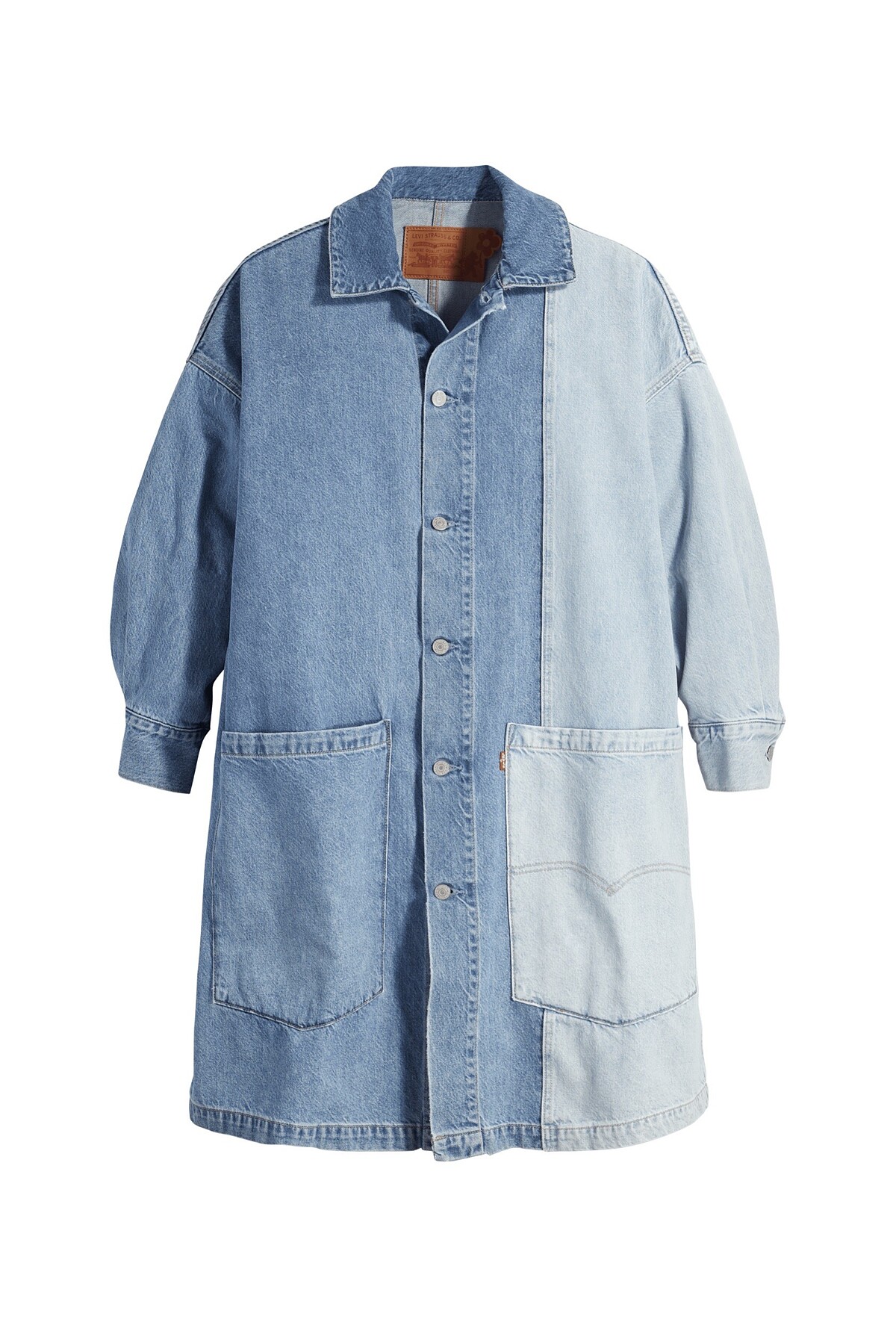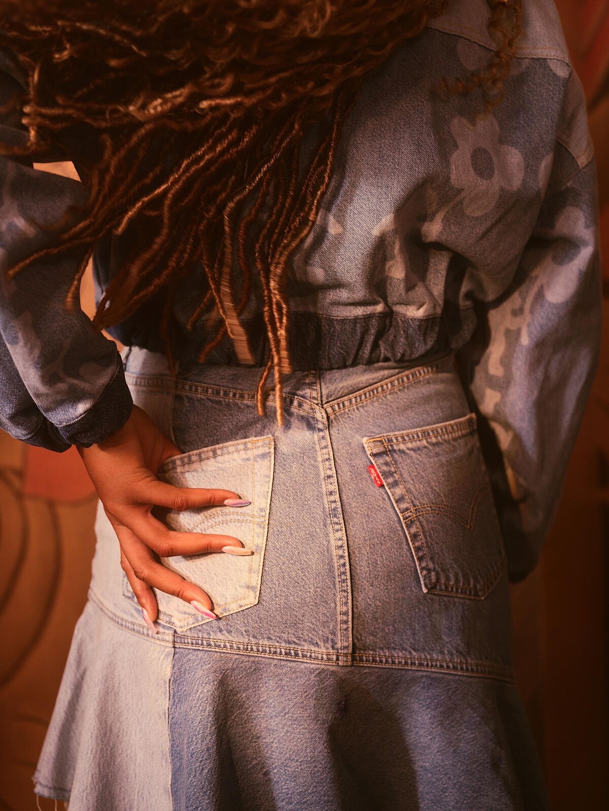 將深淺不同顏色的丹寧拼接一起,運用裁片之間大小差異,翻玩服飾的視覺比例效果。當中比較特別的單品像是不對稱的魚尾裙,浪漫的荷葉滾邊,左邊為俏麗的膝上短裙、右側為氣質的及踝長裙,有一種「橫看成嶺側成峰,遠近高低各不同」既視感。