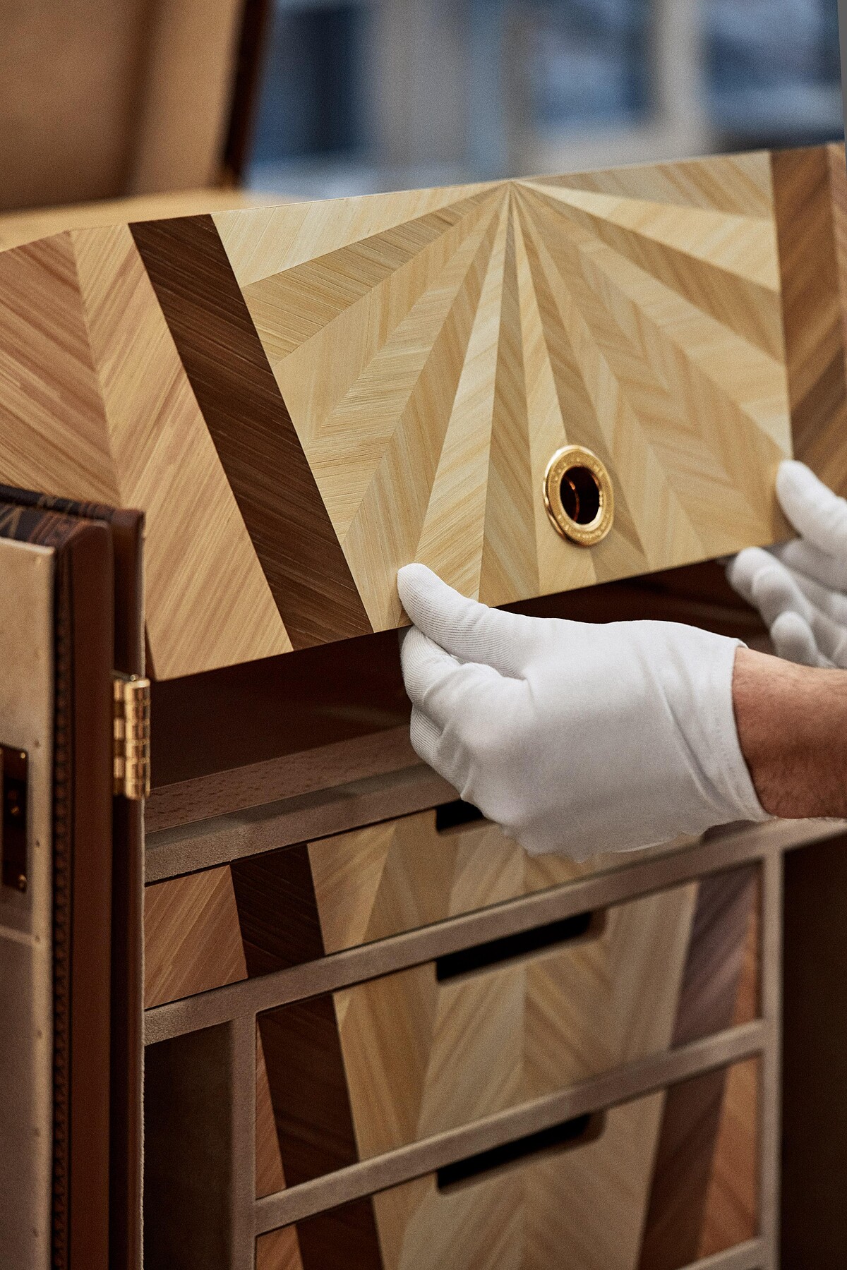 硬箱內裡的木裝採用的是Louis Vuitton「麥稈鑲嵌」技術而製成,僅選用法國勃艮第種植的黑麥秸稈,透過麥稈獨有的低調光澤,深淺色麥稈拼接在一起,呈現出商務人士的頂奢品味。