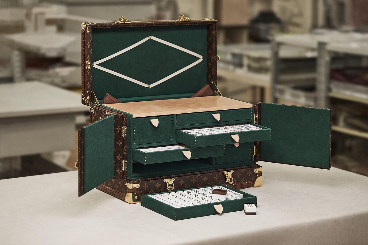 新款的Vanity Mahjong麻將硬箱以經典的LV Monogram裝飾於外,內裏撲上奢華的松綠色絨布。重頭戲當然收納在抽屜格裡面的麻將組,每一顆麻將與骰子皆為純手工打造,並以品牌的logo圖樣取代傳統的麻將花樣,打造不一樣的打麻將體驗。