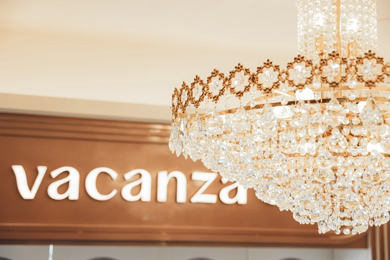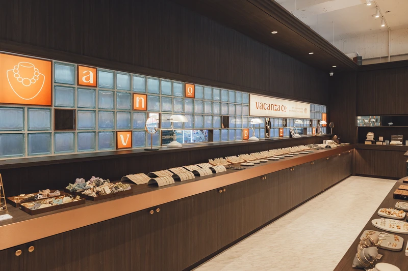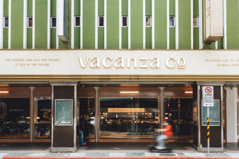 Vacanza進駐萬年商業大樓後,保留大樓原有的外觀,並留下原是豪華鐘錶的水晶大吊燈,接著注入Vacanza代表性風格,像是特別設計的雙面玻璃磚牆,經過光線漫射呈現虛實交錯的視覺效果;大量復古綠花磚紋搭配質感胡桃木紋,加上舊式電話、早期打字機、百葉窗的點綴,營造出懷舊又內斂的復古購物空間。
