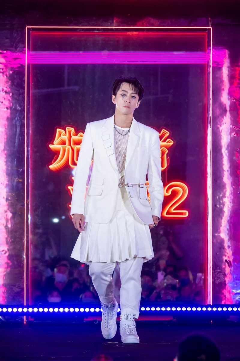 誰說男生不能穿裙子?還有這樣思維的妳可能要加緊腳步跟上了。本次設計師的跨界合作重點更邀請到對舞蹈有相當研究的陳漢典擔任走秀嘉賓,為他打造全白立裁的西裝搭配百褶裙,以傳奇設計師侯斯頓(Halston)為靈感,打破男女服裝界線,將 Disco 文化融入,呈現先驅者主題的先鋒理念。