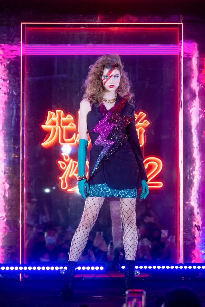 就如同那美好的 Disco 年代,設計師運用了的大量金屬、亮片、漆皮等元素。像是其中一套服裝就運用亮片布料,重現麥可傑克森(Michael Jackson)、大衛波伊(David Bowie)等傳奇代表的造型風格,周裕穎更蒐集了超過 300 片廠商淘汰的二手繡片,以永續精神賦予服裝嶄新面貌。