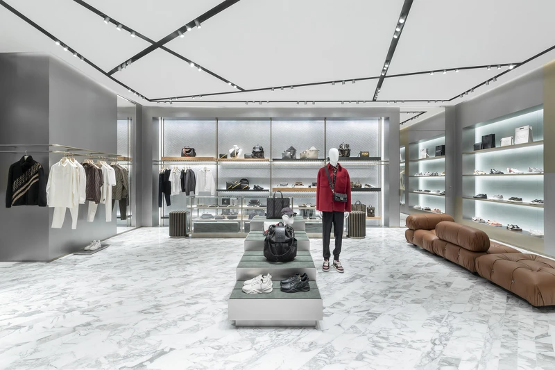 佔地約莫80m2,Fendi首間男裝專門店以一抹高冷的灰銀色為店鋪氛圍定調,有別於女裝的療癒米白色系,男裝店給人一種商務男士的成熟與內斂。