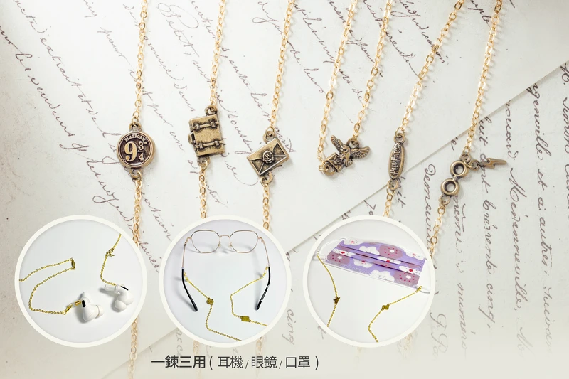 金屬眼鏡鍊是近年復古時尚再流行的話題單品之一,隨著防疫生活口罩不離身的影響,還多了口罩鍊用途,甚至也能當作最有型的耳機鍊使用,一鍊三用也成為近年街頭潮感的必需品。眼鏡鍊上多了貓頭鷹+信封、哈利波特+閃電眼鏡、9 3⁄4月台標示+行李箱等小巧墜飾,用細膩的復古氣氛為帥氣穿搭、甜美優雅增添風格層次,打造獨一無二的混搭時尚。