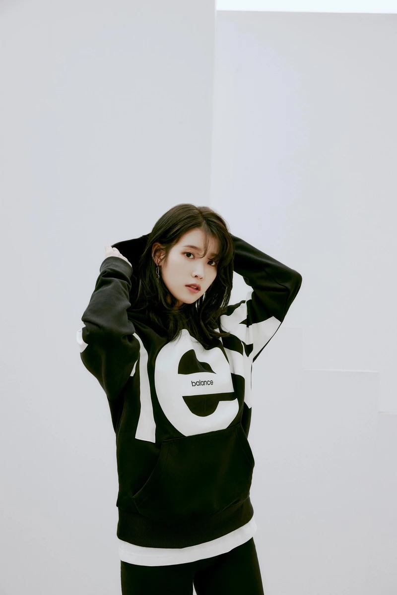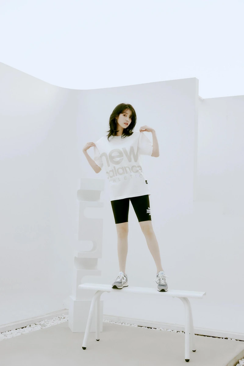 第一套 Look 可以看到 IU 運用簡單的黑白色系為主軸,下身搭配單車褲營造俐落的率性氣質,腳踩灰色球鞋,日常搭配耐看實用。