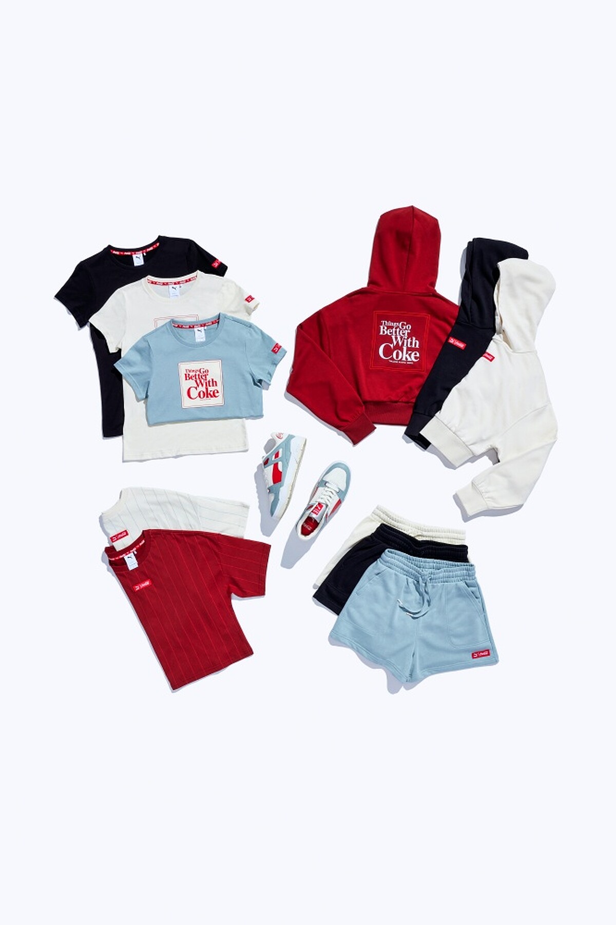 有了球鞋當然少不了服飾系列,Puma以可口可樂代表色打造經典圖樣短袖T恤,印上1965年經典標語「Things go better with Coke」、接著是以可口可樂經典玻璃曲線瓶身搭配1972年的精神標語「It’s the Real Thing」推出的推出的帽Tee、最後則是裝點Puma X Coca Cola 聯名Logo的短版素色短袖 T 恤及高腰短褲休閒套裝。