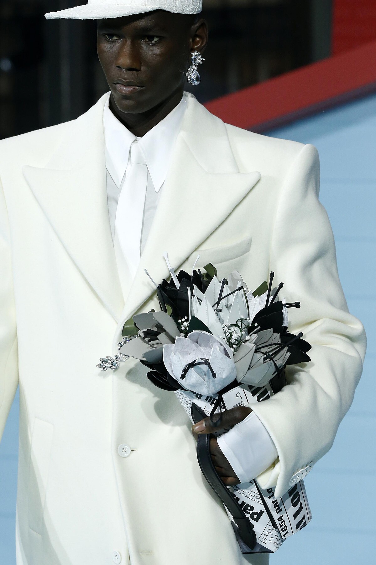 自先前的Birkenstock by 小花刺繡勃肯鞋,Dior 2023春季男裝,Kim Jones再次從迪奧先生對於園藝的熱忱受到啟發,透過花卉的療癒意象來創作,會有花束包的誕生,也是順理成章的結果。