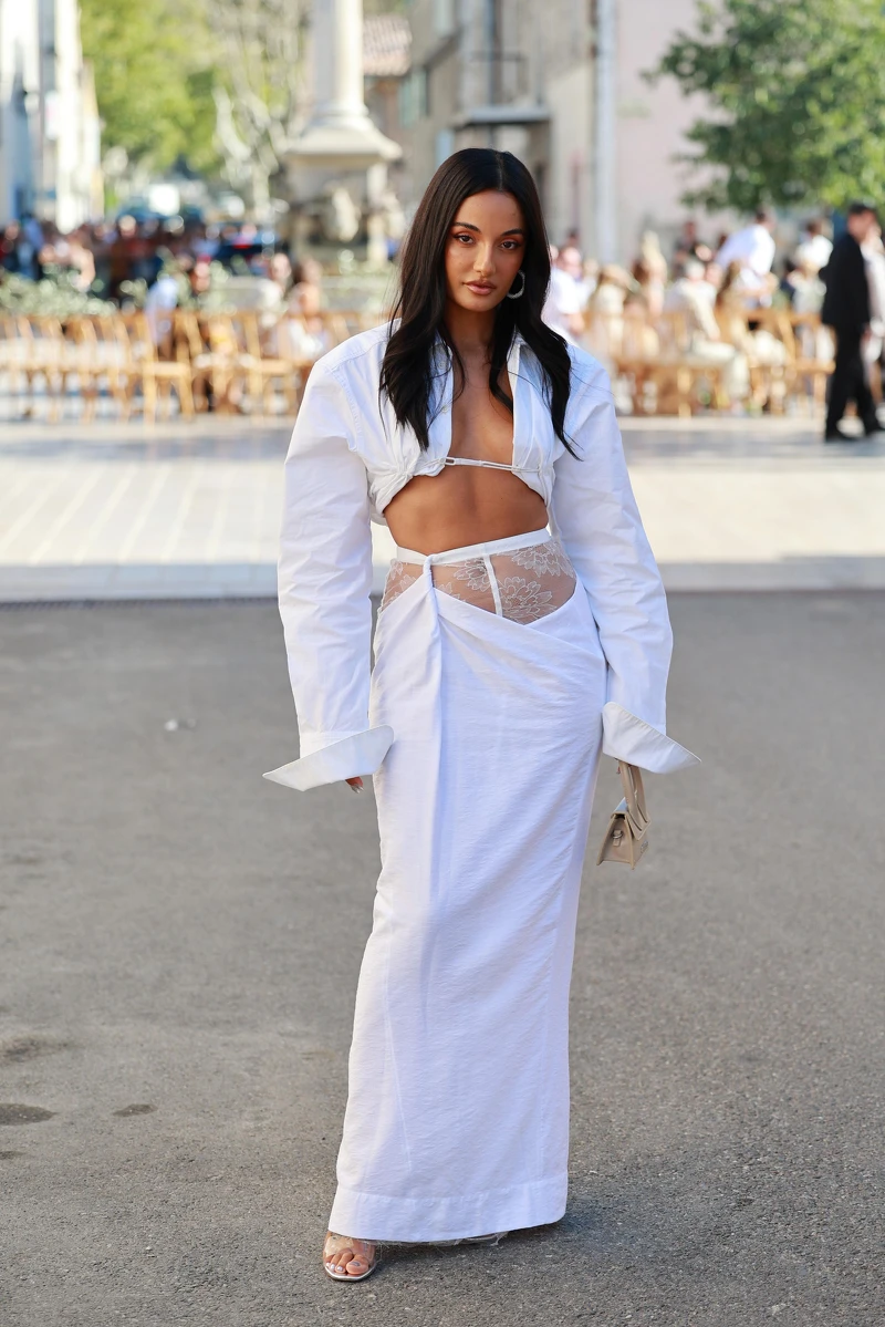 法國It Girl Jeanne Damas身為Jacquemus多年好友,當然也沒少出席。白色的蕾絲細肩帶上衣,搭配著黑巧克色的過膝中長裙,Jeanne Damas選擇搭配透明PVC跟鞋、挽著米色的編織小包,完美演繹南法愜意風情。