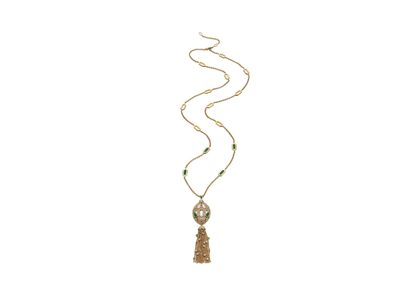 BVLGARI SERPENTI系列黃K金孔雀石鑲鑽項鍊 黃K金項鍊,鑲嵌1顆圓形明亮切割鑽石(重約0.50克拉)、2顆梨形切割孔雀石、14顆花式切割孔雀石與325顆圓形切割密鑲鑽石(總重約3.37克拉)。參考售價:約新台幣2,062,000元 ↑