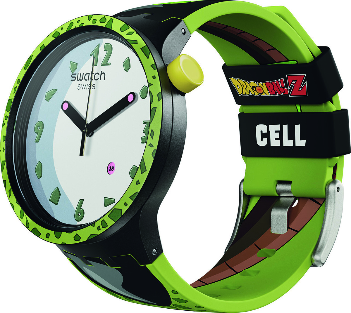 由前紅緞帶軍團科學家 Dr. Gelo(蓋洛博士)為了報復Goku(悟空)而創造的人造人Cell(賽魯),設計靈感採用了賽魯身上標誌性的綠色斑點和黑色的翅膀,指針前端的兩個粉紅小點靈感來自角色的眼睛,背面錶帶上還印有賽魯的尾巴。
