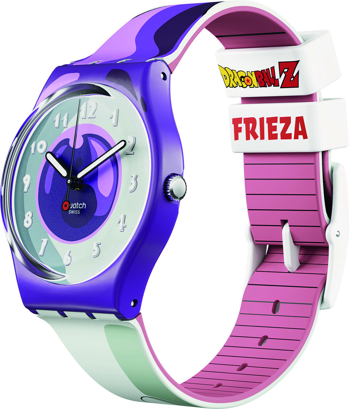 宇宙帝王弗利沙是七龍珠系列中最知名的反派角色,也擁有多種變身型態的大王在正面的錶帶上選擇的是第一型態的白紫設計,背面的錶帶則是加入粉紅色,象徵變身後的弗利沙。