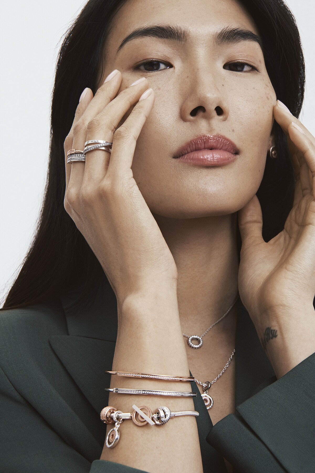 除了明星商品I-D 手環,Pandora以品牌經典吊墜設計為靈感,搭配鍍14K玫瑰金的圓形鏈釦設計,推出Pandora Signature Logo雙色金屬T字釦蛇鏈,可單獨佩帶也可以加入Signature串飾或吊飾增加造型的層次感。