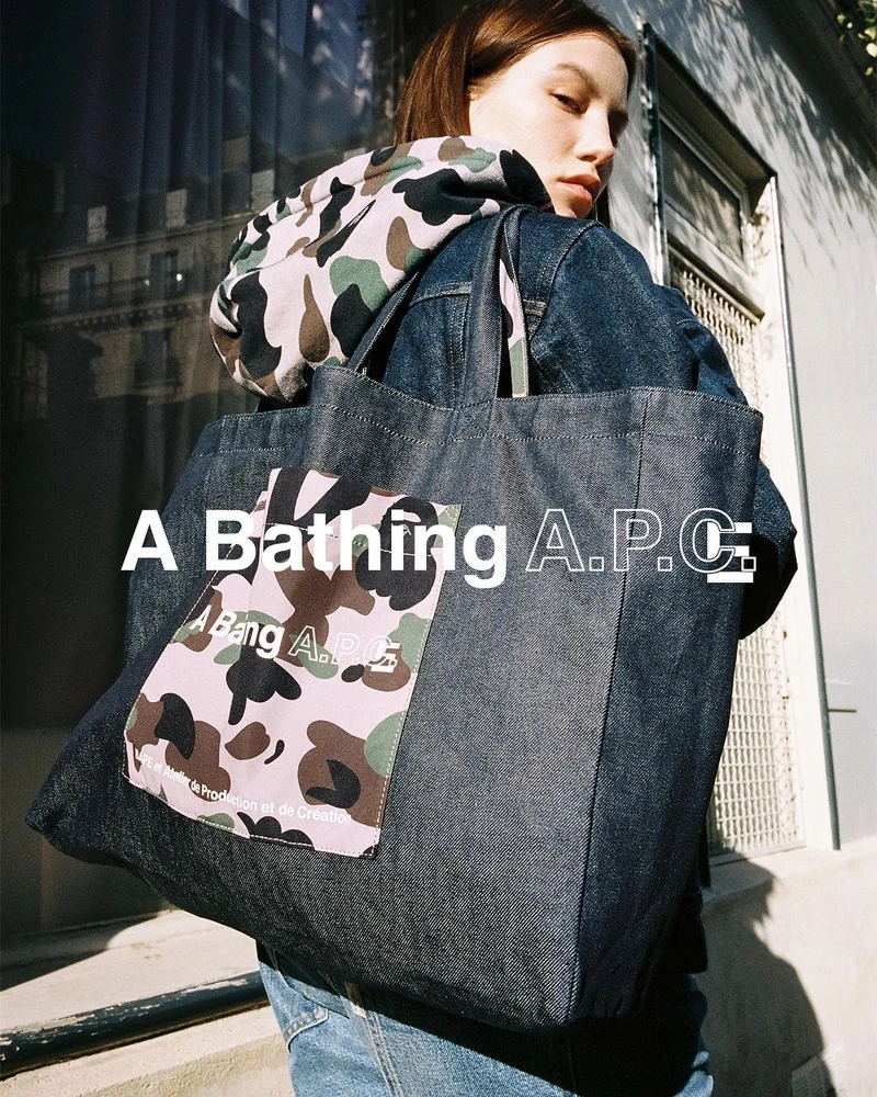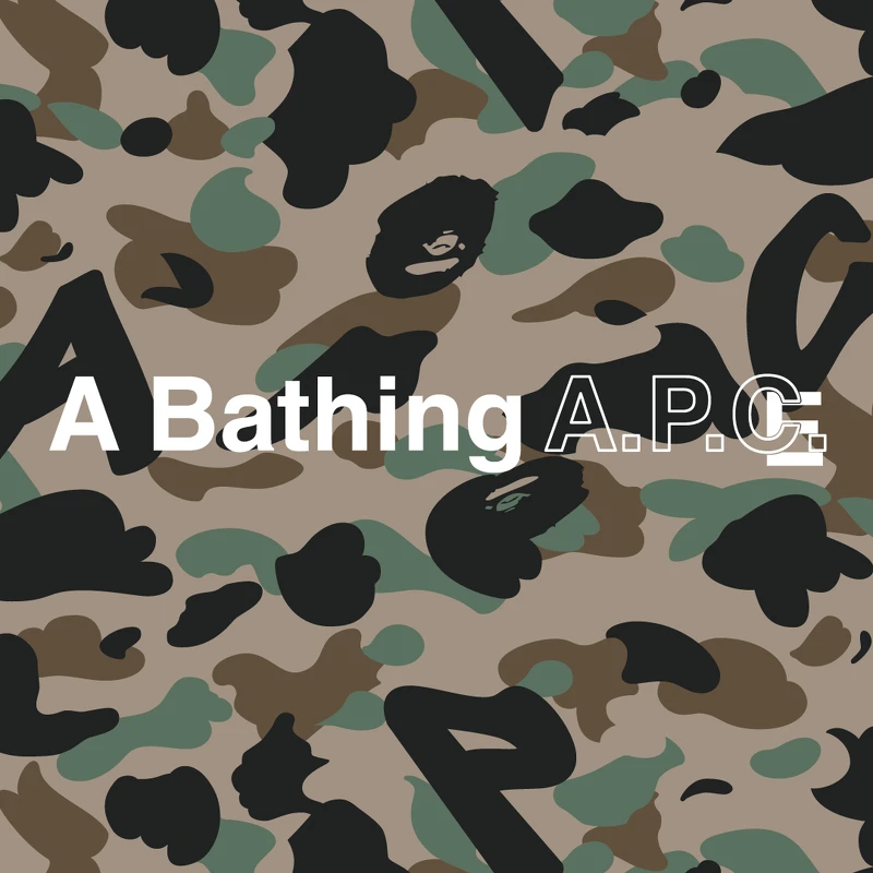 A Bathing Ape®將最具辨識度的BAPE®迷彩印花,結合最能代表A.P.C.的極簡風品牌標誌,打造出全新迷彩圖騰,並運用在休閒連帽上衣、水洗牛仔裝、趣味短Tee、寬版衛衣、迷彩牛仔托特包、迷彩腰包和棒球帽款。