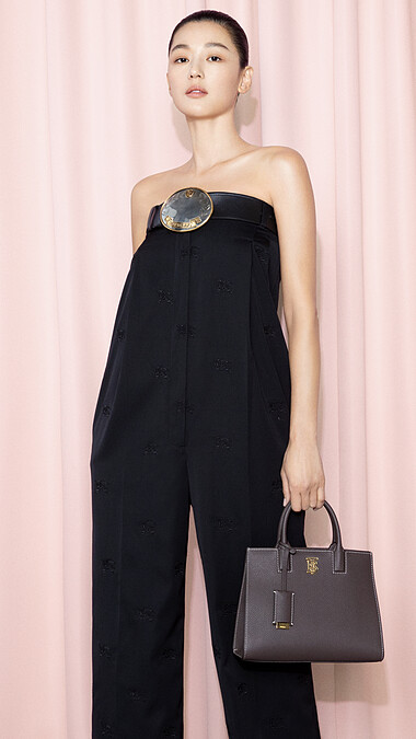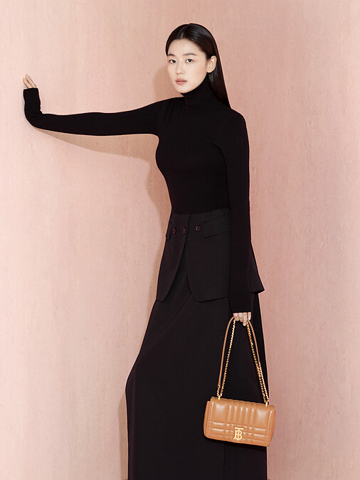 身為代言人,當然都是搶先大家一步穿上和戴上品牌的最新設計。在首波的形象照裡,全智賢拎出Burberry還尚未開賣的Frances包包,簡單的梯形輪廓,提把中間綴以TB logo,散發著都會女性的時髦與幹練;隨包還附有一面小小的化妝鏡掛飾。而全智賢搭配的是迷你尺寸,顏色為深灰棕色。