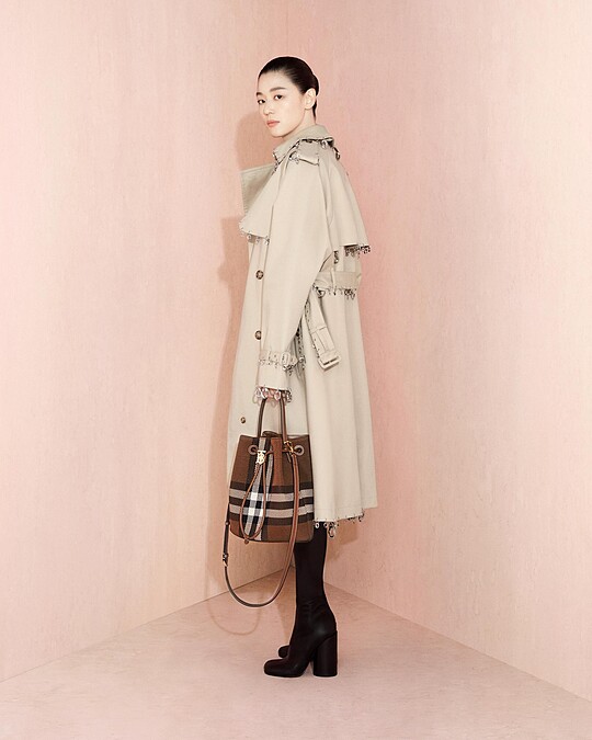 最後一顆是永遠不會過時的水桶包包型,在包包縮口的拉繩綴有品牌的TB標誌,可手提也可以肩背。只不過,全智賢手上的是隱藏版的經典格紋印花款,目前官網上僅有素色的皮革樣式可挑選。