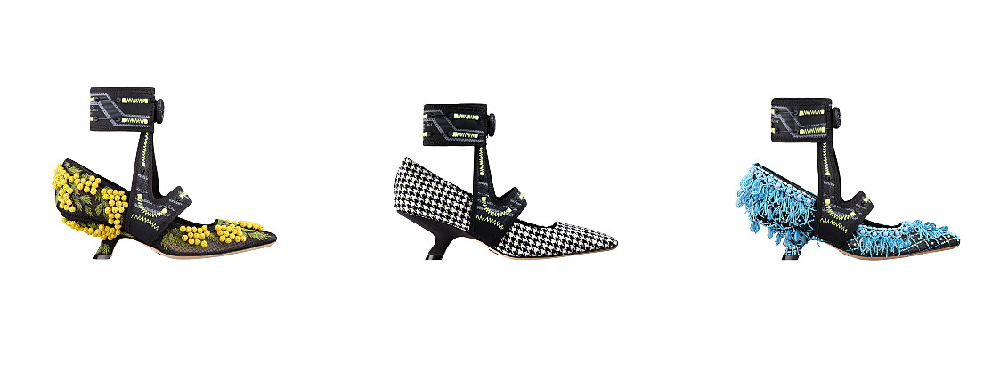 華麗夢幻的裝飾結合可調整式高科技腳踝束帶,與足踝完美貼合。此系列的靈感來自重型機車,以超輕氯丁橡膠為材質,搭配螢光黃縫線,讓 Dior 62-22 高跟鞋流露融合時空的混搭風情,結合歷史傳承與革新創意。品牌創意總監以前所未見的大膽創作,再次歌頌優雅風範與女性魅力。