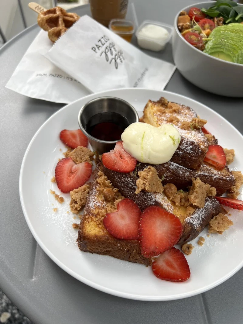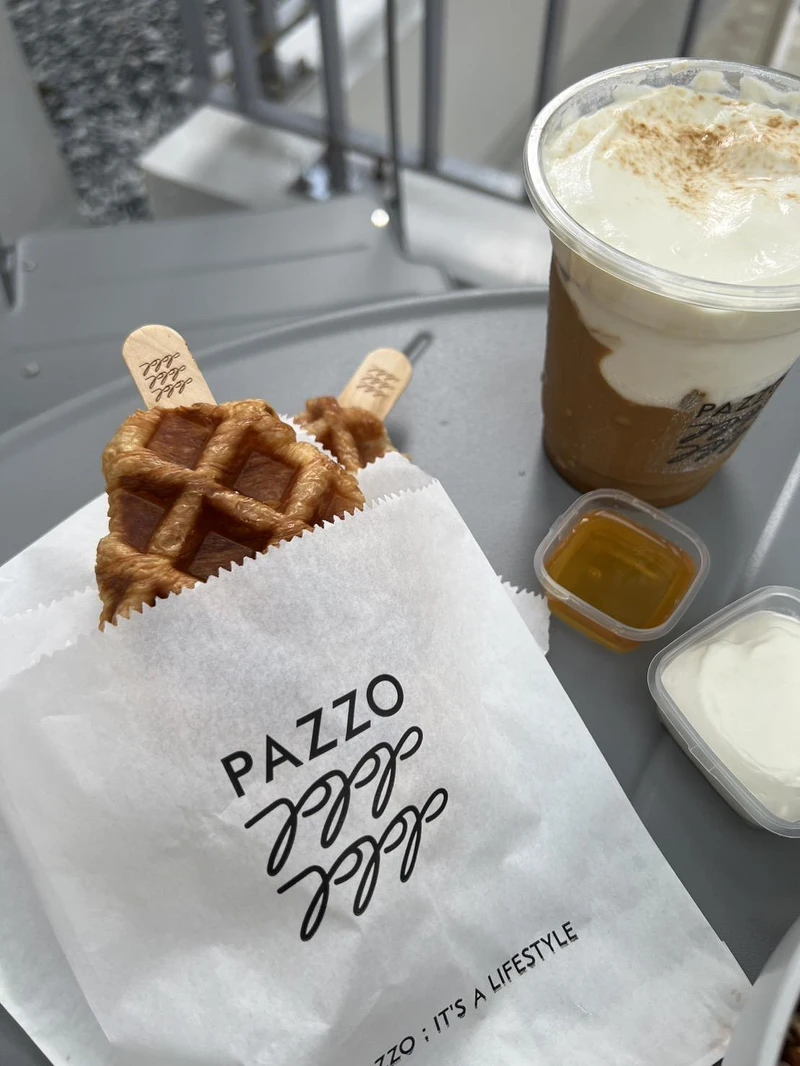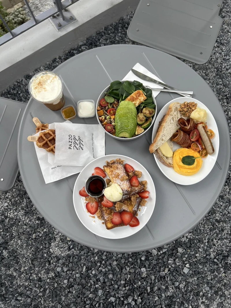 走上二樓是Pazzo特別邀請進駐的人氣餐廳Brun不然早午餐,灰白色打造而成的用餐空間,搭配北歐風木桌椅,除了可以品嚐到Brun不然早午餐的人氣餐點,還有與Pazzo合作的Pazzo可頌鬆餅、焦糖拿鐵等聯名餐點。