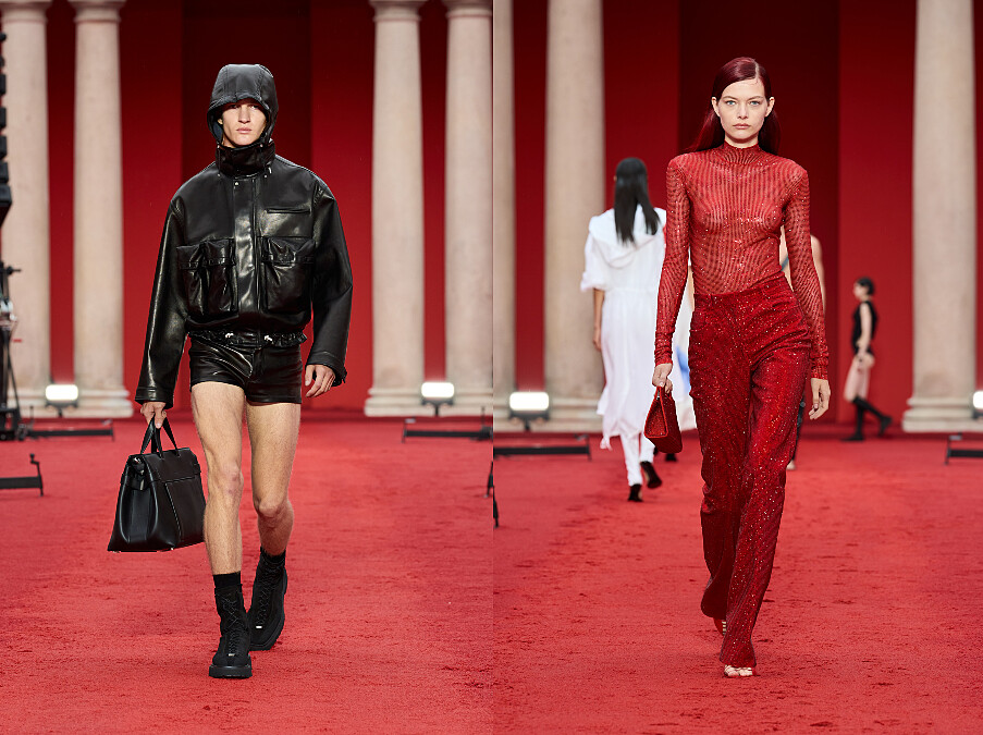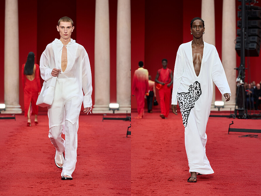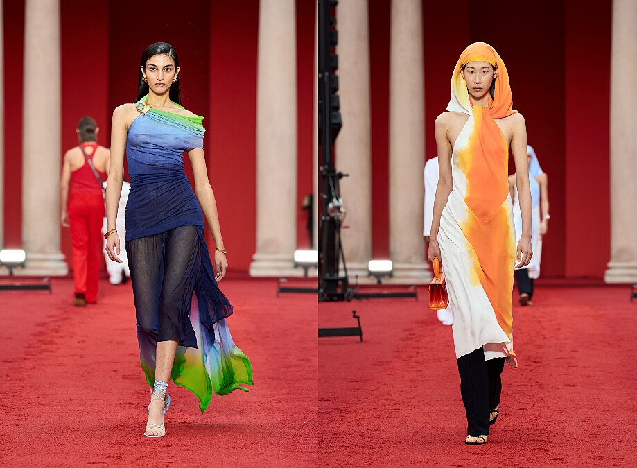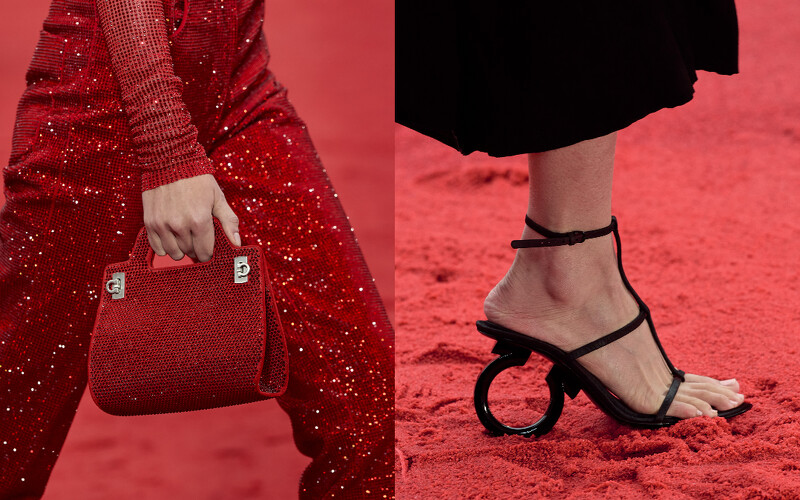 色彩的選用源自於美國視覺藝術家Rachel Harrison的Sunset系列作品,運用了許多褪色的印花與手染的針織單品,顏色包含光亮白、深靛藍、奶油黃及天空藍。全新的Pantone紅色,正式展現了品牌經典的色調,是整個系列發表中極為重要的存在。本次秀場坐落於米蘭市中心一座融會巴洛克與新古典主義風格的古建築中,是世界上最古老的神學院之一,費時修復,於本次時裝周首次敞開神秘的大門,與Maximilian Davis 的首個系列一同登場。酒店廣場地板覆蓋上一層鮮豔的紅色細沙, 「沙子與Ferragamo、好萊塢、海洋皆有關聯,也與我自身的DNA有關。大海對於加勒比海文化而言,是一個你可以反思和感受的地方,我想要透過Ferragamo的視角展示這個觀點。」 Maximilian Davis說道。